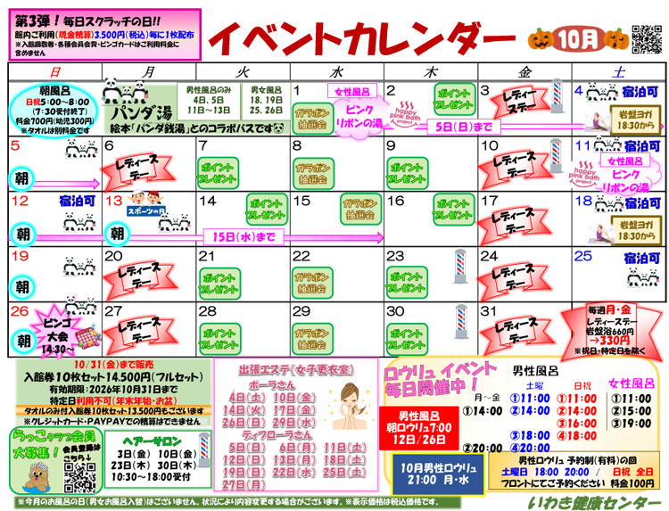 ・毎週月曜日・金曜日レディースデー 岩盤浴660円→330円 ※祝日・特定日を除く。