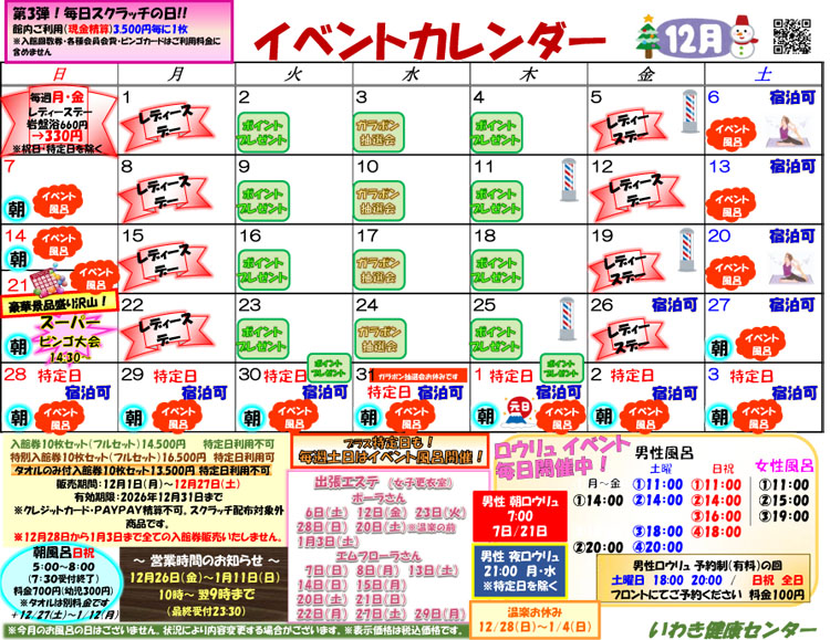 男性風呂のみ:4日、5日、11日~13日