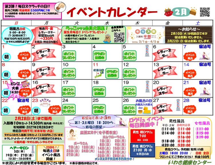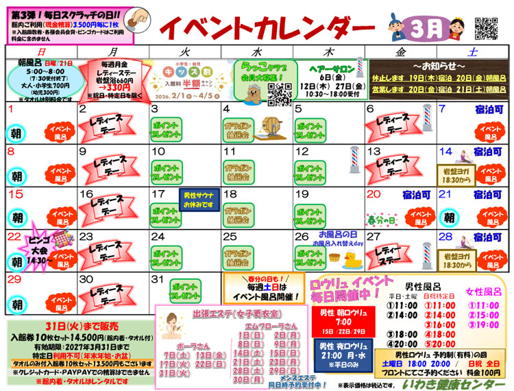 ・3月20日(金・祝)祝日ですが朝風呂営業はいたしません。宿泊営業いたします。