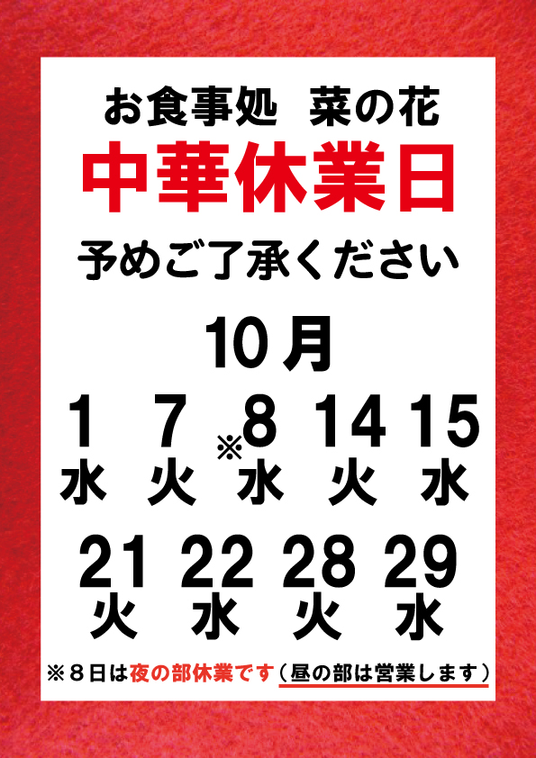 【10月】中華お休みの日