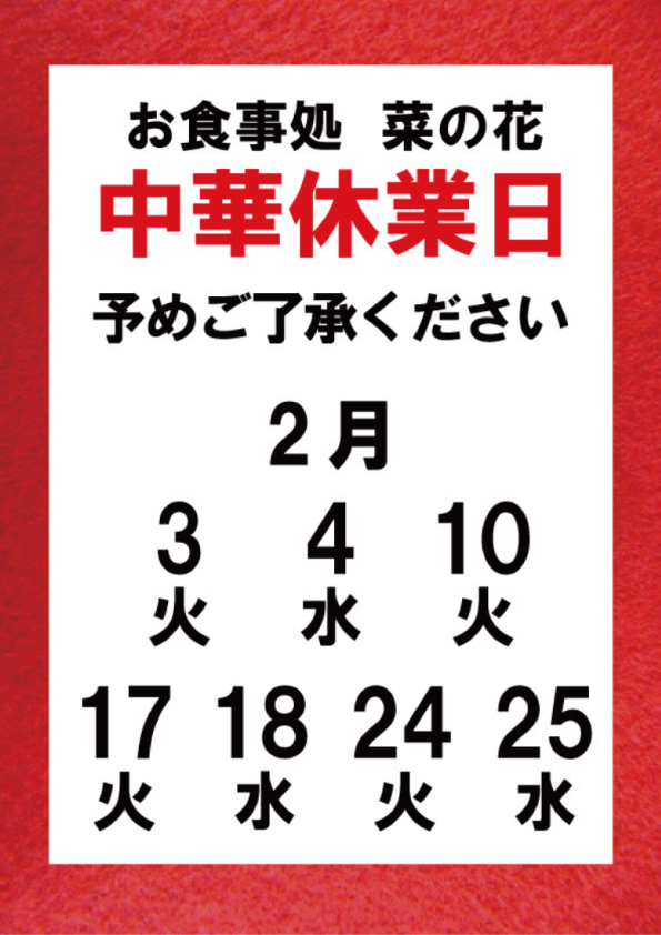 お食事処「菜の花」の中華お休みの日をお知らせいたします。