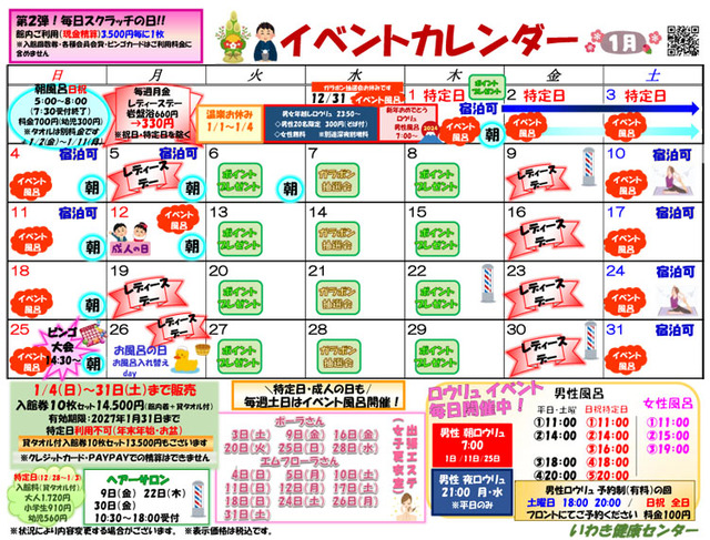 ・朝風呂日祝 5:00~8:00(7:30受付終了)料金700円(幼児300円)※タオルは別料金です。 1/2(金)~1/6(火)