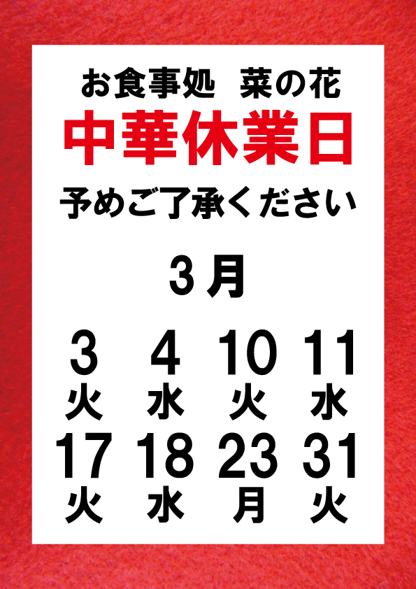 お知らせ 【3月】中華お休みの日 ご覧いただきありがとうございます。 お食事処「菜の花」の中華お休みの日をお知らせいたします。 予めご了承ください。 3月 3日(火)4日(水)10日(火)11日(水) 17日(火)18日(水)23日(月)31日(火)